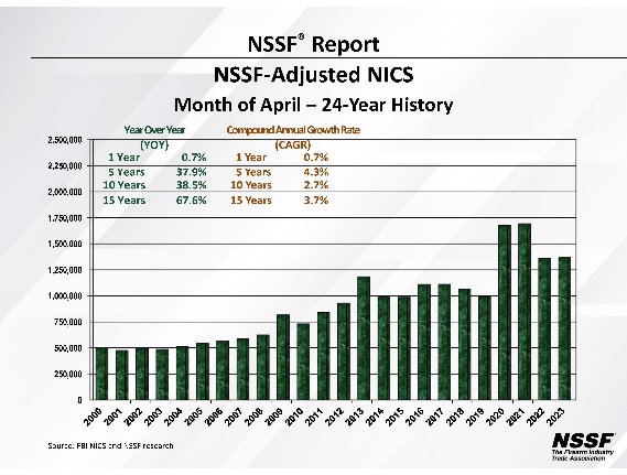 The April 2023 NSSF-adjusted National Instant Criminal Background Check System (NICS) figure of 1,369,296 is an increase of 0.7 percent compared to the April 2022 NSSF-adjusted NICS figure of 1,359,908. For comparison, the unadjusted April 2023 FBI NICS figure 2,616,729 reflects a 3.3 percent increase from the unadjusted FBI NICS figure of 2,534,057 in April 2022.