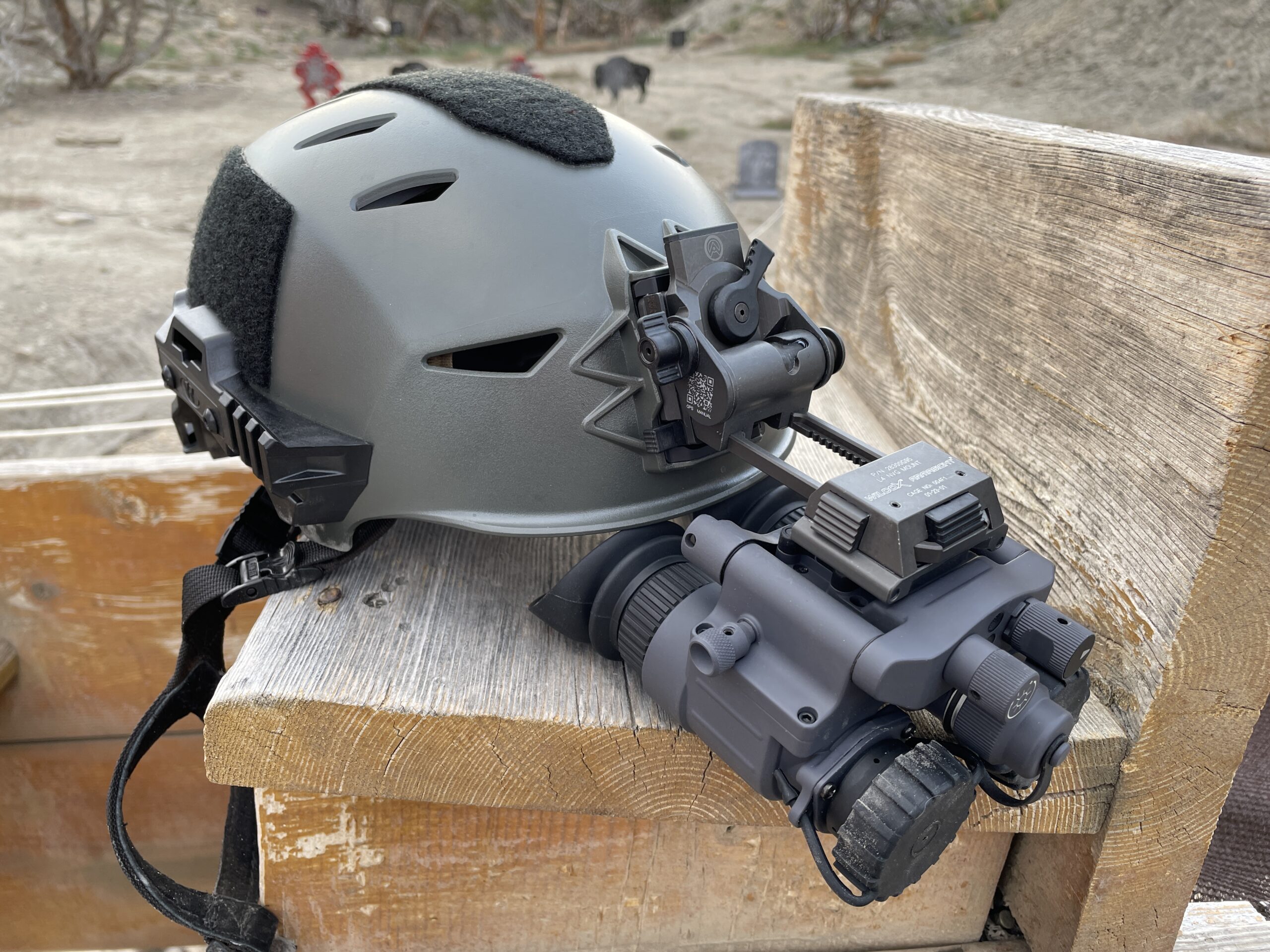 I got to shoot with the Pinnacle Premium night vision bundle that includes a helmet, all the mounting gear and BNVD-51 night vision binoculars.