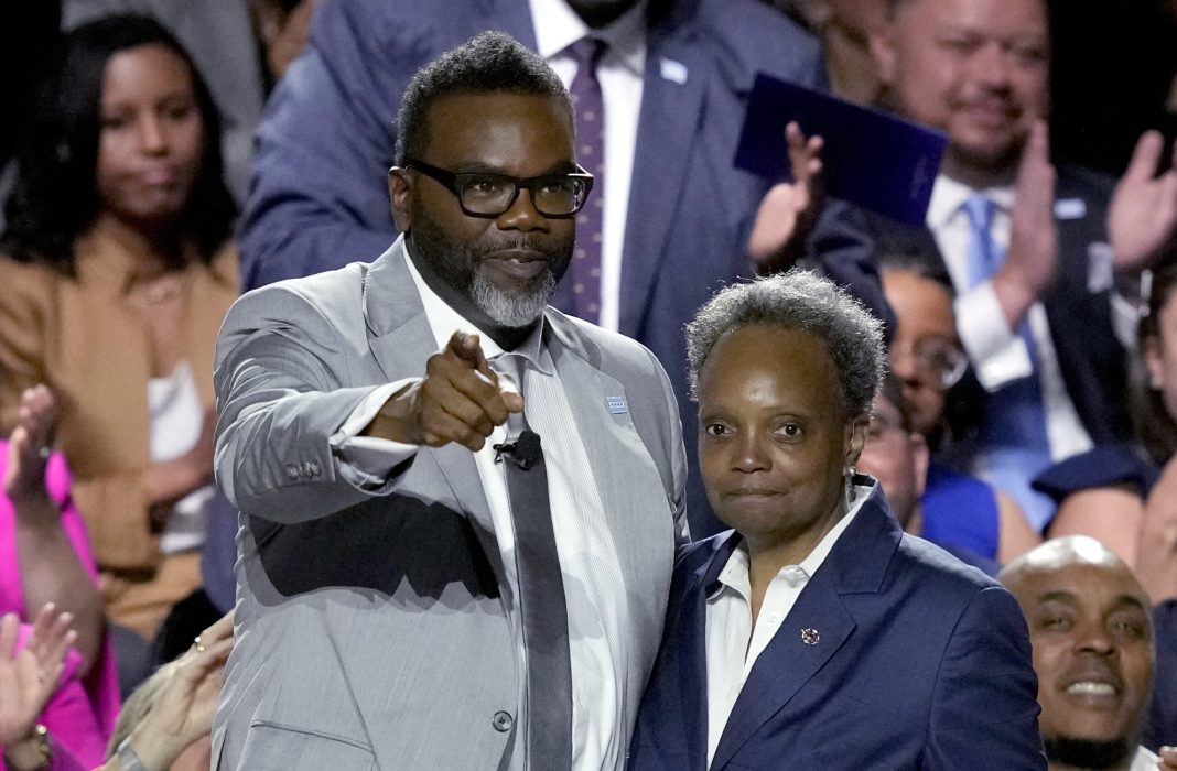 Chicago Mayor-elect Brandon Johnson, acknowledges out-going Mayor Lori Lightfoot, during his inauguration as the city’s 57th mayor Monday, May 15, 2023, in Chicago. (AP Photo/Charles Rex Arbogast)