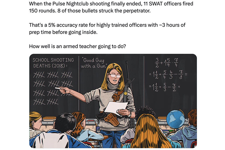 How well is an armed teacher gonna do? Better. Because they are highly motivated at the time to not die.