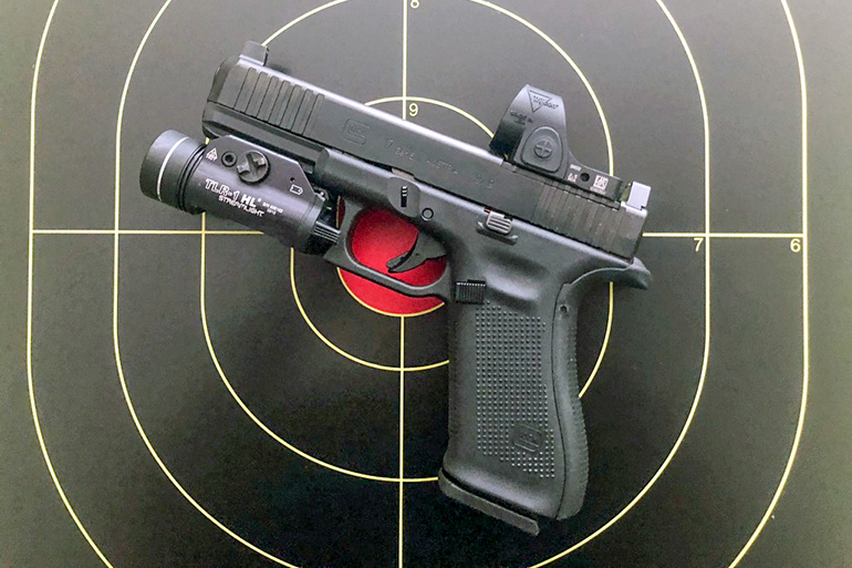 Okay. Sold. So I ordered a G17, figuring I’d keep my 1911 as my bedroom gun. In accordance with my “it’s not cheating if it means you survive” philosophy, I ordered the MOS version, and promptly equipped it with a Trijicon SRO, Trijicon tall iron night sights (for co-witnessing) and a Streamlight TLR-H1 weapon light that turns a darkened room into a daylight shooting situation. (Bonus: the weight of the light helps control muzzle flip.)