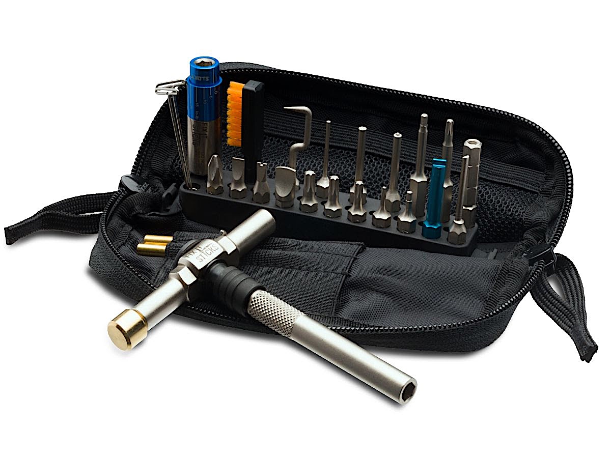 The Compact Pistol Kit for Sig Sauer is contained in a soft zippered carrying case with a molded low profile bit holder that is designed to hold any bit / accessory with a standard 1/4″ Base (including Fix It Sticks Torque Limiters), and any 8-32 threaded component. With overall dimensions of 6 1/2” x 2 5/8” x 1 5/8” this kit easily fits in glove boxes, tool storage compartments, range bags, etc.