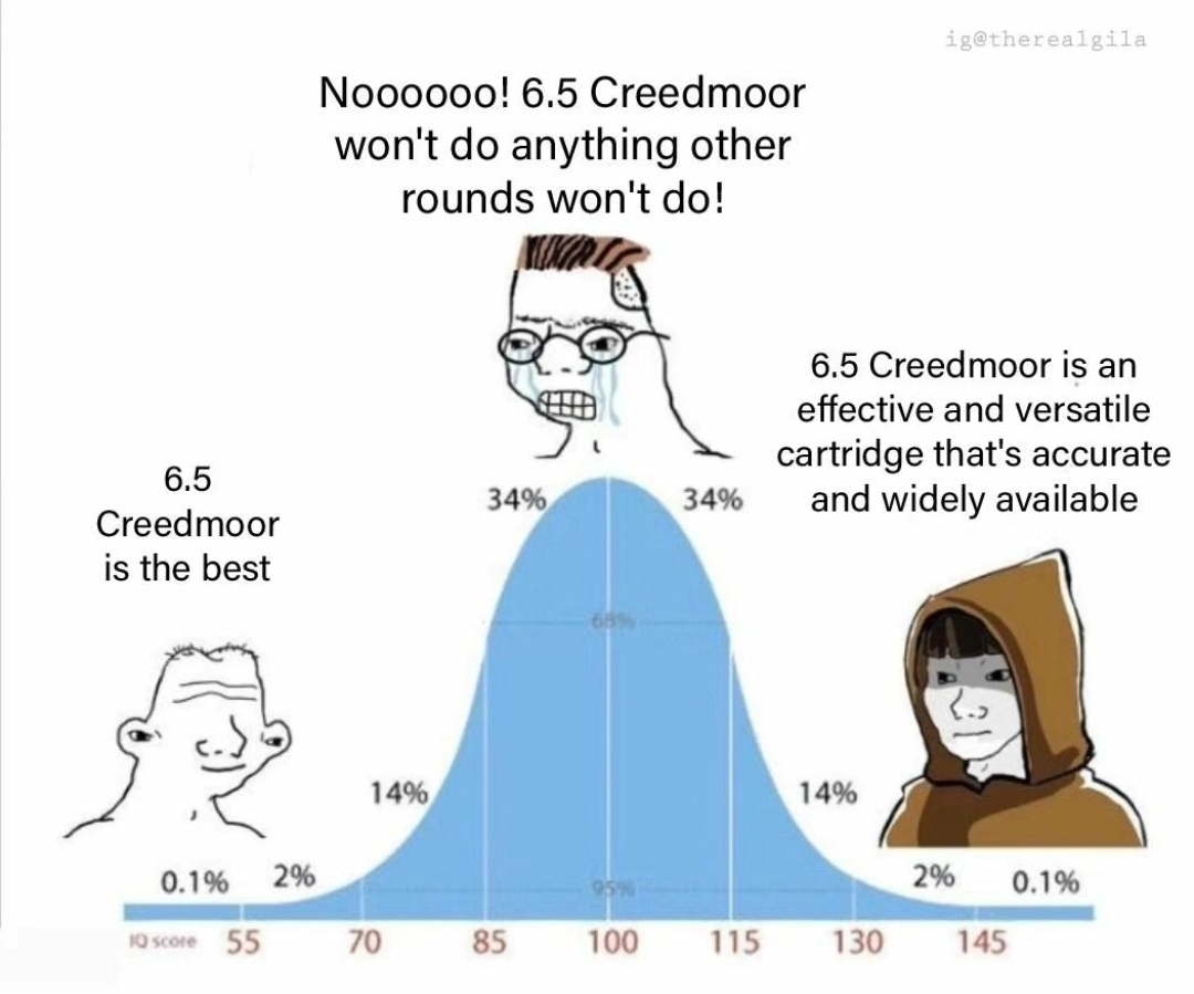 I think that about summarizes the standard distribution of opinions on 6.5 Creedmoor. Now I just have to figure out if I’m the guy on the left side or the right side LOL