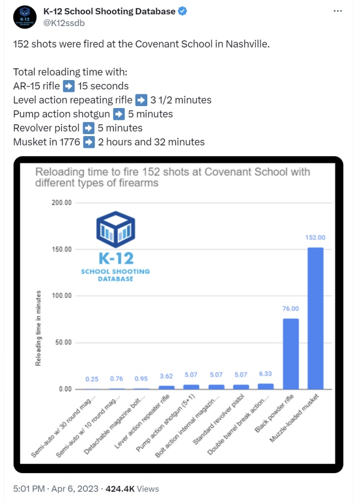 At the heart of the matter for me was a chart K-12 SSD posted showing “reloading time to fire 152 shots at Covenant School with different types of firearms.” The reference here is to the March 23 school shooting in a Nashville church school.