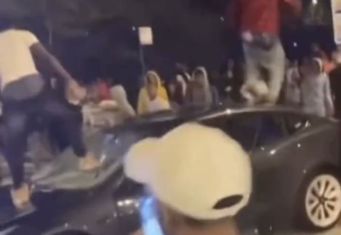 Cell phone video shows group jumping on vehicle along Michigan Avenue https://t.co/vyGYiYnHpp pic.twitter.com/gm00vZdwrO