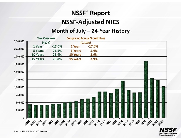 The July 2023 NSSF-adjusted National Instant Criminal Background Check System (NICS) figure of 1,023,903 is a decrease of 17.0 percent compared to the July 2022 NSSF-adjusted NICS figure of 1,233,115.