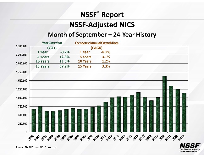 For comparison, the unadjusted September 2023 FBI NICS figure 2,035,410 reflects a -16.5% percent decrease from the unadjusted FBI NICS figure of 2,437,563 in September 2022.