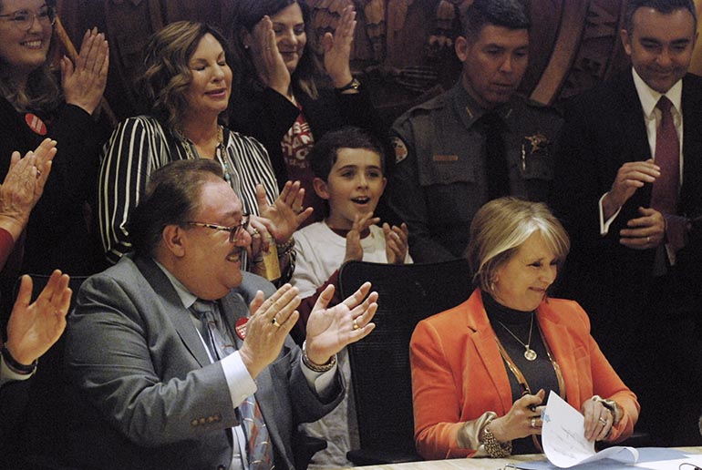 Democratic New Mexico Gov. Michelle Lujan Grisham signs a bill into law in 2019 that expanded background checks to nearly all gun sales in New Mexico (AP Photo/Morgan Lee)