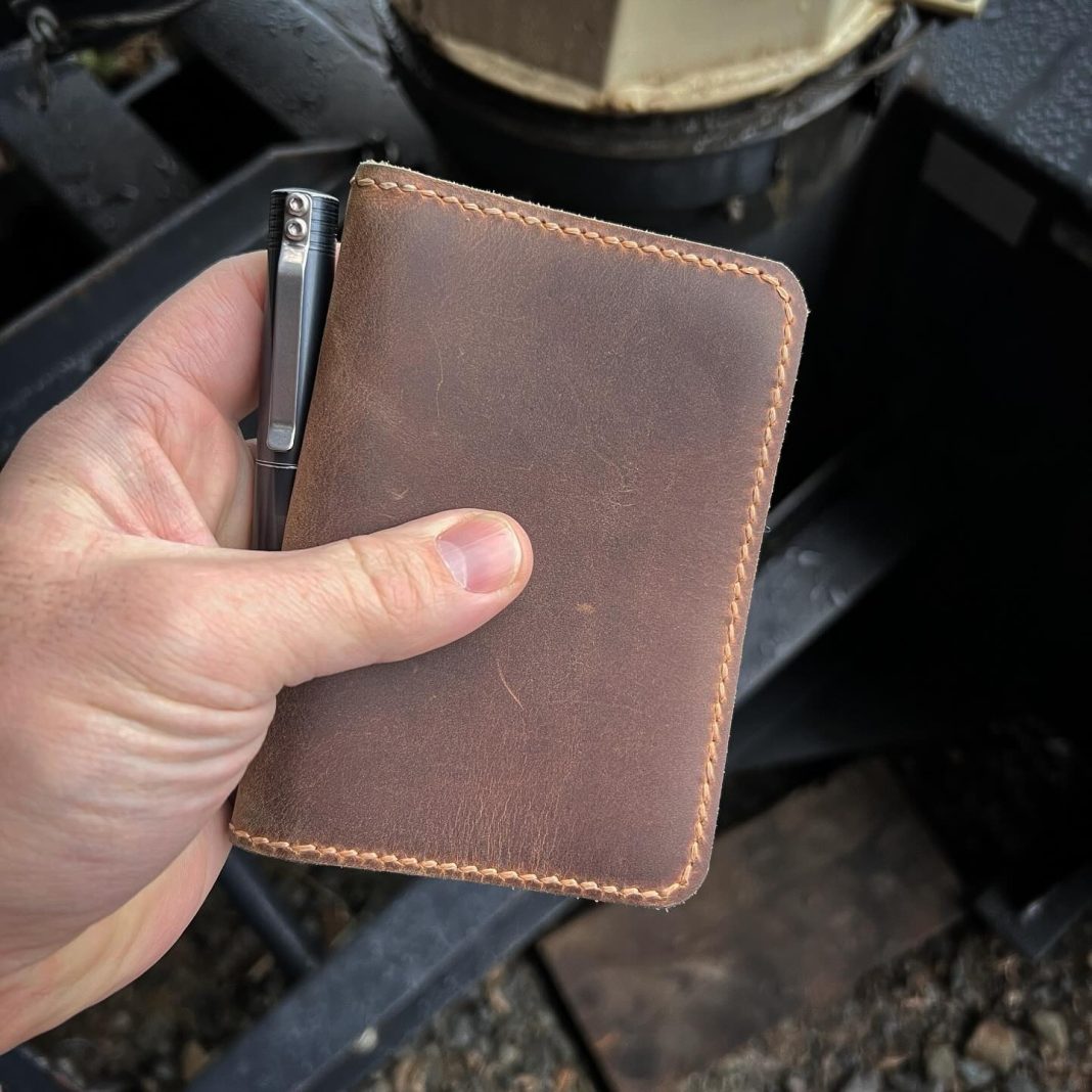 I often carry a standard mini composition book in a back pocket to log workouts, take notes in church, log range data, remind myself of appointments, or anything else I would like to track on actual paper. These notebooks can be surprisingly durable if you buy the type that is stitched and then taped on the binding. However, the basic cardboard or craft paper covers will eventually degrade faster than I can fill one with notes. This is where the leather cover comes in…