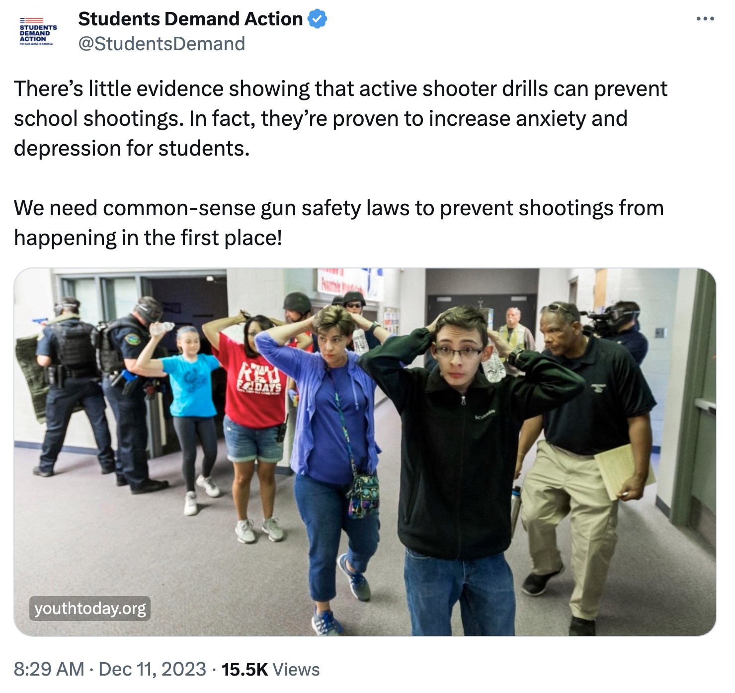I’d recommend reading the whole thing, but long story short, the article doesn’t support Students Demand Action’s assertion at all. It’s clear that active shooter drills are a proven way to reduce casualties and don’t harm children when they’re planned and conducted responsibly.