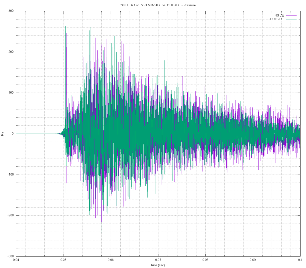 In the chart above, the green line represents the dB metering result of firing a 223 Remington outdoors, and the purple line is firing the same setup indoors. The huge peak at 0.05 seconds (50 milliseconds) is the gunshot and it’s identical in both cases, then there’s the sound reflection off the ground at about 0.057 seconds that’s actually lower in the indoor test (the ground inside the building is sand, whereas the ground outside is compacted dirt), then there are sound reflections off the walls beginning at about 0.074 seconds that only exist in the indoor testing, of course.
