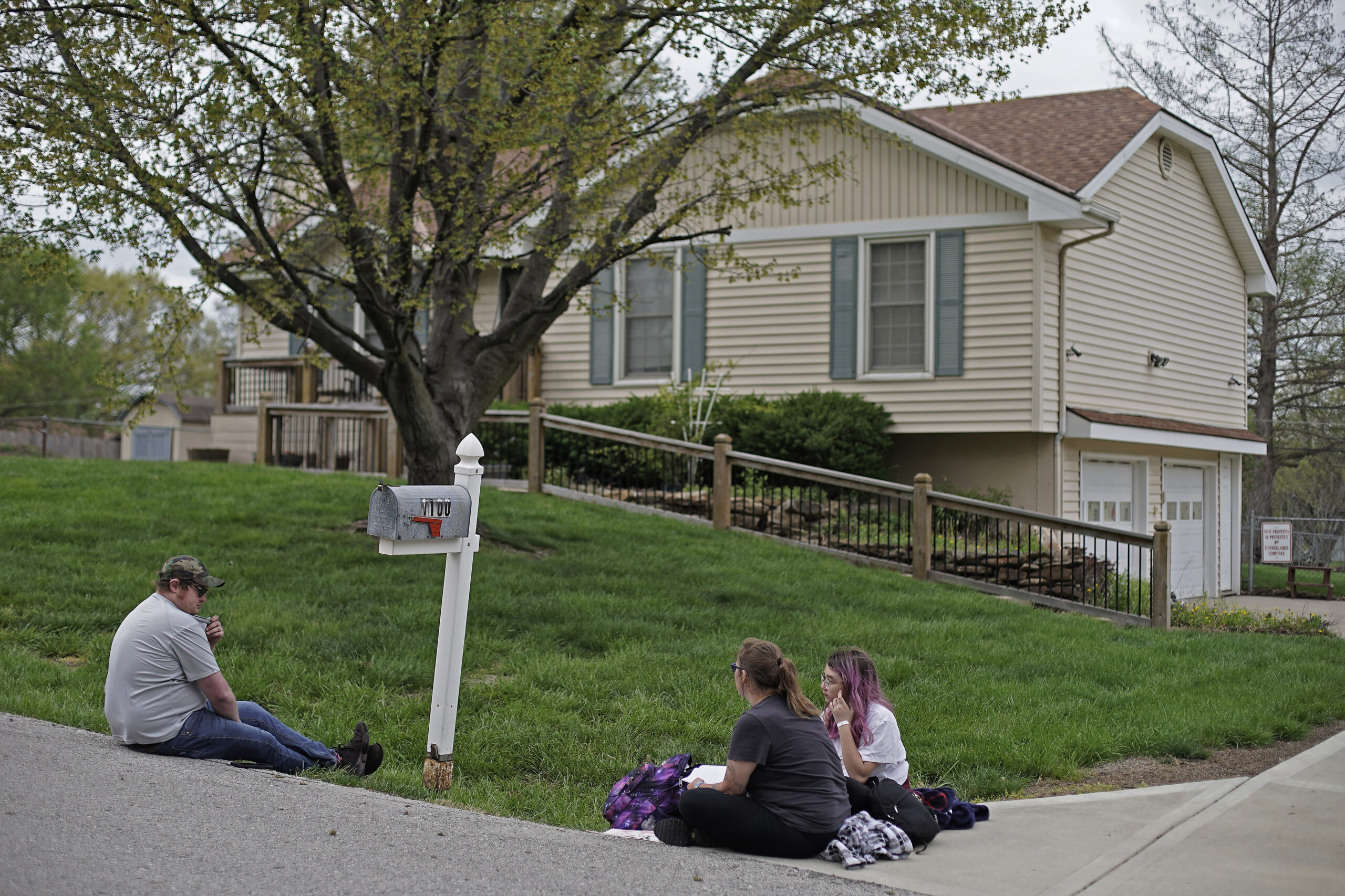 Trisha Loftis and her daughter Ashlyn, 13, from Los Angeles, talk with Jordan Loecer, from Raytown, Mo., Wednesday, April 19, 2023, as they sit in protest in front of the house where 84-year-old Andrew Lester shot 16-year-old Ralph Yarl when he rang the doorbell at the mistaken address a week earlier in Kansas City, Mo. (AP Photo/Charlie Riedel)