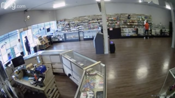 Three hold-up men who were robbing a Shreveport vape store earlier this week lost track of who was in the business when they pulled their guns. In the image above, you can see two men on the left slip out the door as the thieves busied themselves with the clerk behind the counter on the right.